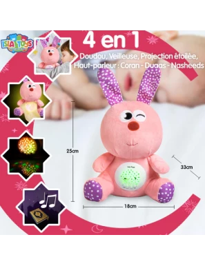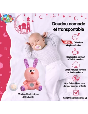 Grâce au module électronique détachable , le doudou devient un compagnon tout doux pour votre véritableNouveau, avec notre détecteur de pleurs , dès que votre petit trésor pleure, un capteur réagit instantanément. Apaiser votre enfant en diffusant en boucle les douces sourates protectrices Al-Fathia & Ayat Al-Kursi pendant une demi-heure. Une caresse spirituelle qui enveloppe votre bout de chou, l'entourant de réconfort pour qu'il retrouve rapidement le sommeil paisible . Un geste tendre, une présence bienveillante pour bercer les rêves de votre tout-petit. Doudou nomade ou sans fil, il a donc l'avantage d'être déplaçable dans n'importe quel endroit ou bébé s'endort.3 en 1 – Doudou, projecteur, veilleuse Réglage du volume sonore et de la projection lumineuse